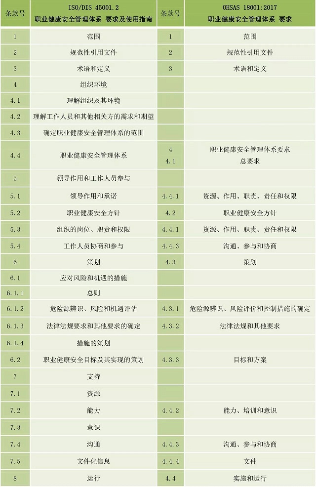 ISO 45001的構(gòu)建是在OHSAS 18001已有的規(guī)范上,其主要目標(biāo)是相同的,都是為提高組織的職業(yè)健康安全績效。同時(shí),通過以下表1框架的對比,也存如下不同之處: